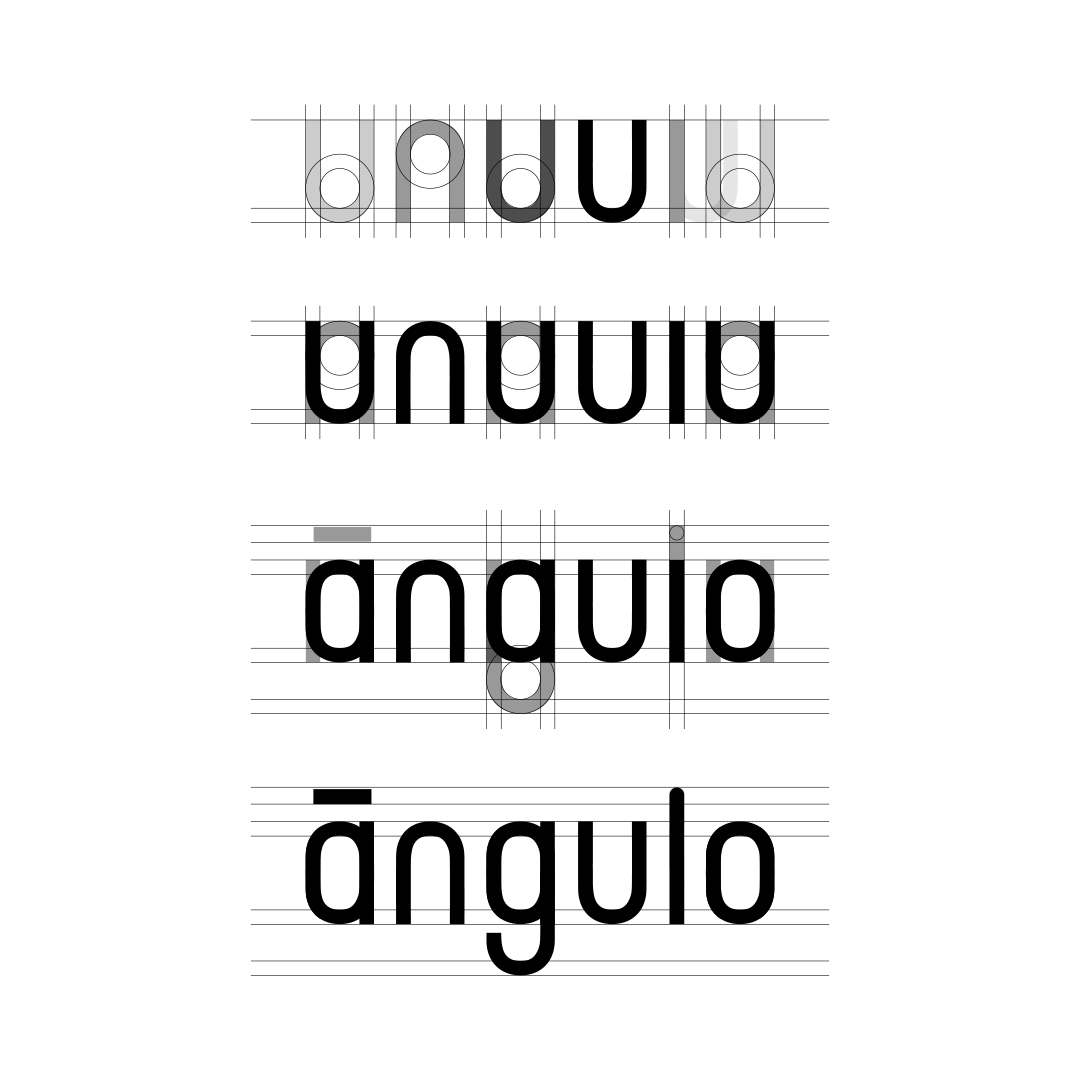 Para el desarrollo de esta marca hemos construido nuestra propia tipografía a partir de una letra u sencilla. Tras formar el logotipo, nos hemos centrado en el acento sobre la a. Hartos de la confusión generada durante años sobre si somos ángulo o angulo nos parecía importante trabajar sobre este tema.