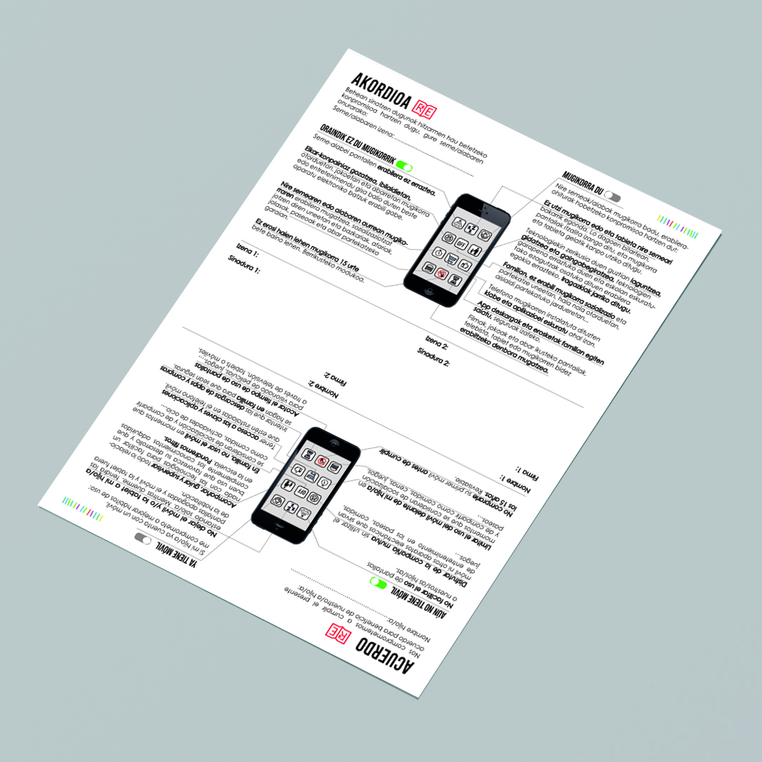 Campaña para concienciar en el retraso del uso del móvil en edades tempranas. Patrocinado por la Fundación Caja Vital. Creación de logotipo, cartelería, pegatinas, señalética, diseño de diferentes acuerdos dependiendo de la franja de edad de los niños y niñas. Estos acuerdos son firmados por ambas partes padres e hijos. Una iniciativa muy interesante.