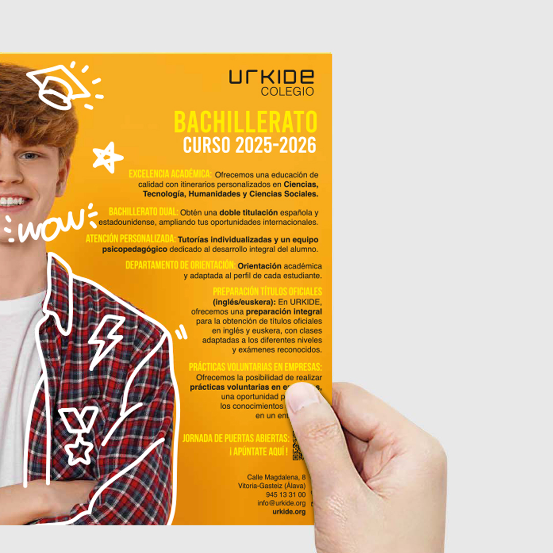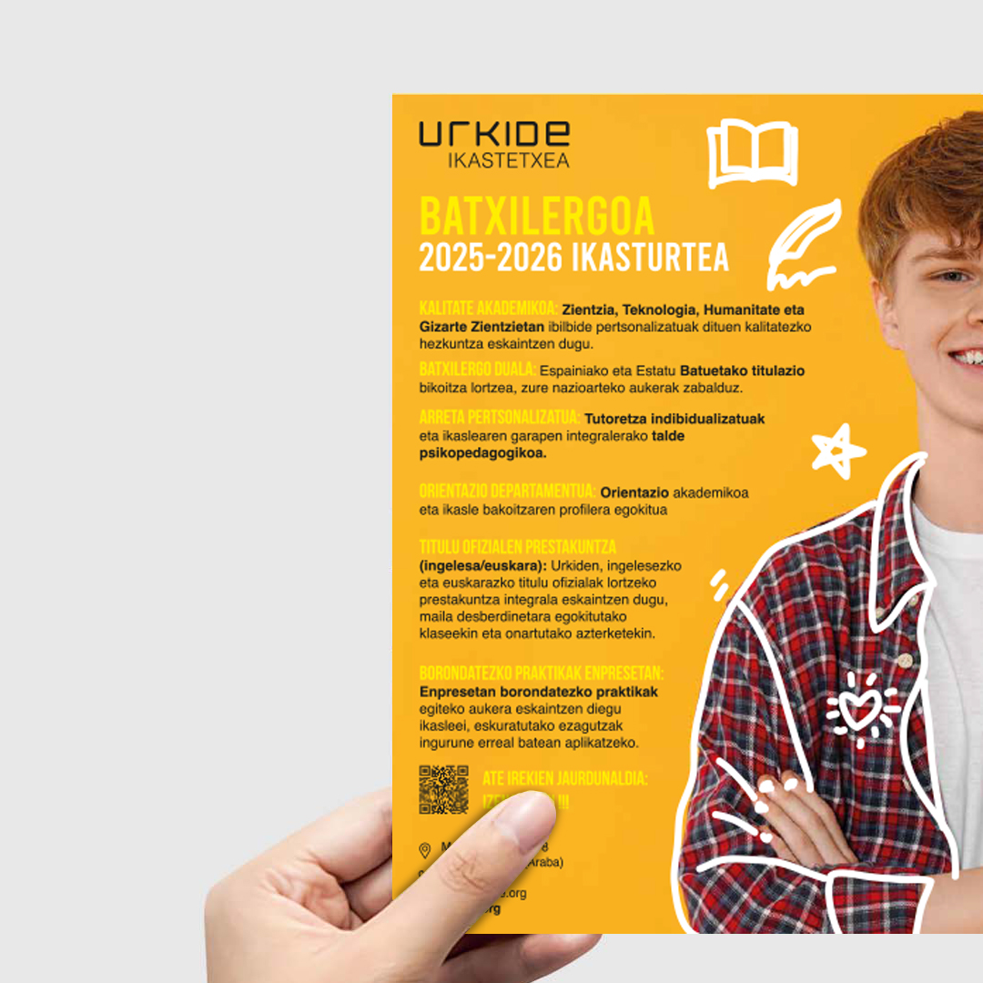 Cuando llega el periodo de captación de nuevos alumnos, en este caso URKIDE recurre de nuevo a La Consulta Creativa, para diseñar un folleto atractivo que logre captar la atención de los más jóvenes. En este caso, al tratarse de una cuartilla bilingüe y trabajar ambos lados, jugamos con la simetría del rostro de un joven: al unir dos cuartillas se forma la cara completa, con un lado en castellano y el otro en euskera. En el diseño utilizamos un recurso ilustrativo que acompaña la imagen, aportando un estilo más desenfadado, juvenil y visualmente atractivo, apoyado en una paleta de colores llamativos.
